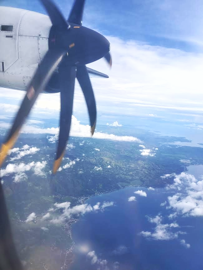 飛行機はセブパシフィック航空を利用した。今回は往復5,200ペソほど。なぜかテンションが上がる小型プロペラ機だ!セブを飛び立ち、ボホールの上空を通ってカミギンへ。寝る間もなく55分で到着(笑)。近い。