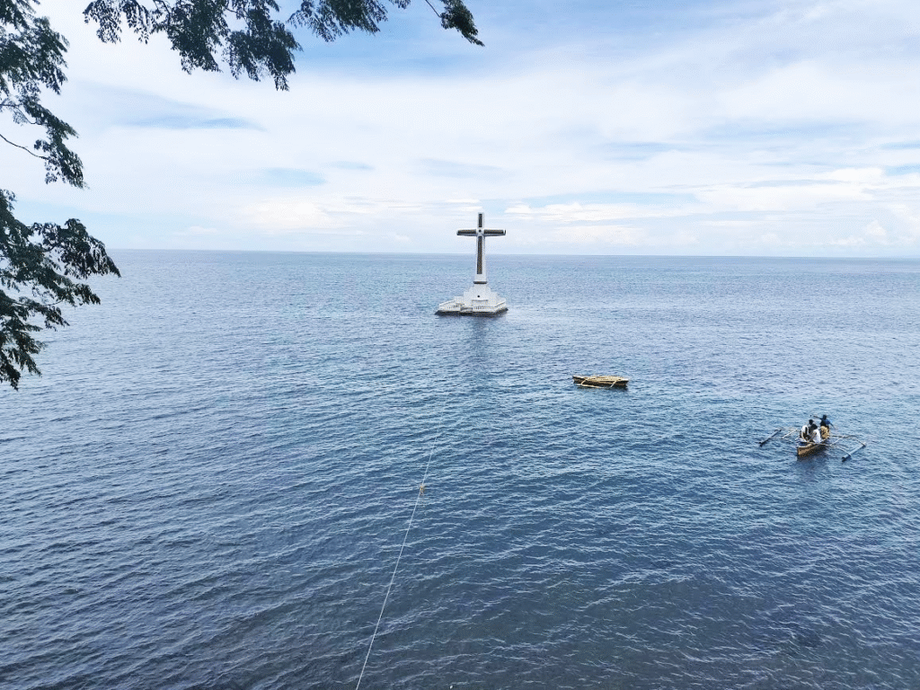 しばらくすると、海上に立つ十字架が見えてきた。カミギンの観光スポットのひとつ、『サンキン・セメタリー(Sunken Cemetery)』だ。私の浅い知識では、昔の噴火で海に沈んでしまった墓地の代わりに建てられたそうだ。十字架までは船でアクセスできるほか、ガイドを付けたシュノーケリングも可能だそうだ。時間があればシュノーケリングもやってみたいが、今日はとりあえず観光だけ。
