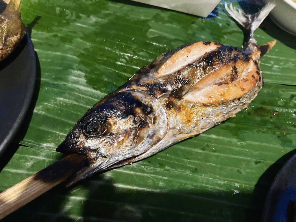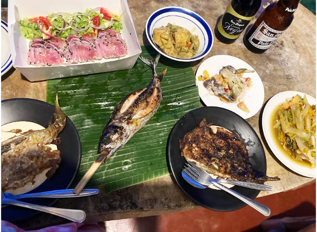 『ガイサノ』によって、フィリピンのビール『サンミゲル』とその黒ビールをゲット。その後マグロのたたきが評判のレストランでそれをゲット。その名もまんま『Tuna Tataki(ツナたたき)』だった(笑)。まだ腹を満たすには不十分であるため、朝のカレンデリアに寄ってナスのオムレツ、ナスのサラダ等おいしそうなものをゲット。そしてカレンデリアの奥さんの妹さんが道路脇で焼いていたマグロの丸焼きをゲット。** さあ、準備はそろったぞ!