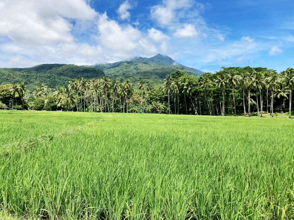天気にも恵まれ、眼下には青い海が広がっている。片方には海、もう片方には山々がそびえ立ち右に左に目を奪われる。カミギンは7つの火山があるそうで、ところどころ噴煙だろうか、立ち上る煙が見える。山を背後にいただいた田んぼの景色が実に絵になる。カミギンに来て驚いたのは、ココナッツの木が異様に高いことだ!セブのそれよりすくすくと育っているように見うけられる。バイクで周遊している途中、ココナッツの葉を道幅いっぱいに寝かせた道路封鎖に遭遇。脇には少年が立っている。何事かと前方上方を見上げてみると、小学生くらいの子どもたちがココナッツの木に登り、次々と道路にその実を落としている。ココナッツの葉で作られた即席コーンも設置されており、安全対策にも抜かりがない。いやはや、たくましい子どもたちだ。