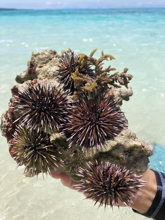 潮の関係だろうか、50メートルほど沖に出ても足がつくほどの遠浅の海。残念ながら亀が泳ぐには浅すぎるが、トッキトキに尖ったウニを多数発見。フィリピン人は唐辛子入の酢をつけてウニを食べる。私も一度それを試してみたが、純日本人の私は絶対にそのままがうまいと思う(笑)。捕まえたウニを浜に離すと、上手に波に乗ってどんどん移動していく。そんなウニの行く先を眺めたり、マングローブの木陰に入って持参した菓子を食べたり、波打ち際であえて波に翻弄されてみたり。空間と時間が贅沢すぎる。