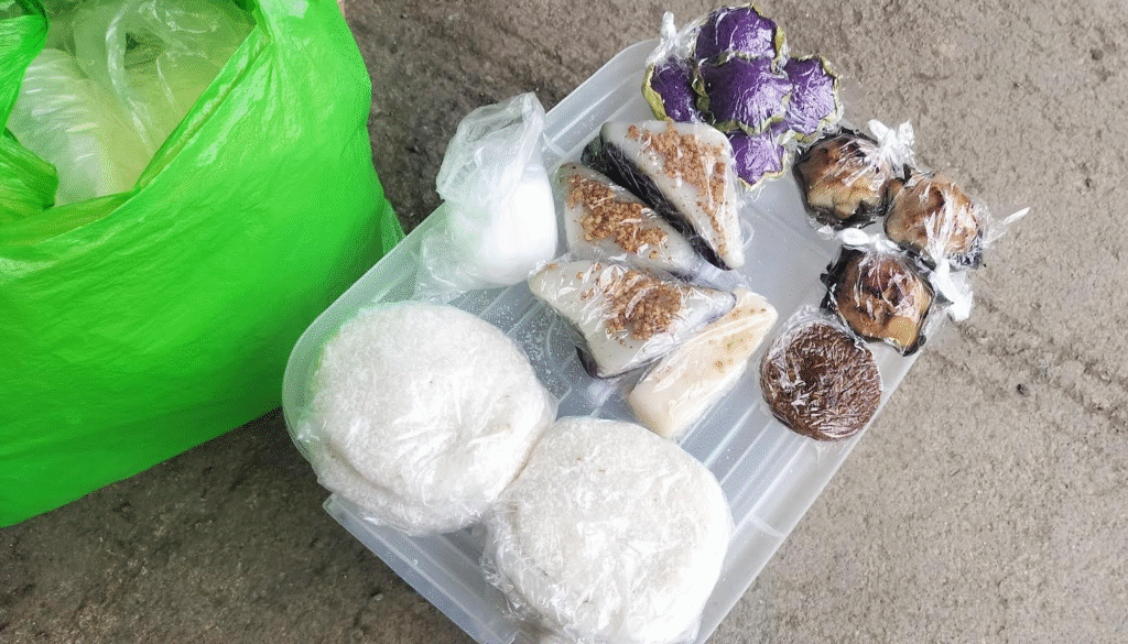 私の経験から申し上げると、路上お菓子の材料は、もち米、黒糖、ココナッツ、キャッサバを使ったものが多い。また、バナナの葉に包まれて売られているものが多く、その良い香りは日本で子どもの日に食べるちまきを連想させる。ちなみに、キャッサバというのは、タピオカの原料になるイモ科の植物である。