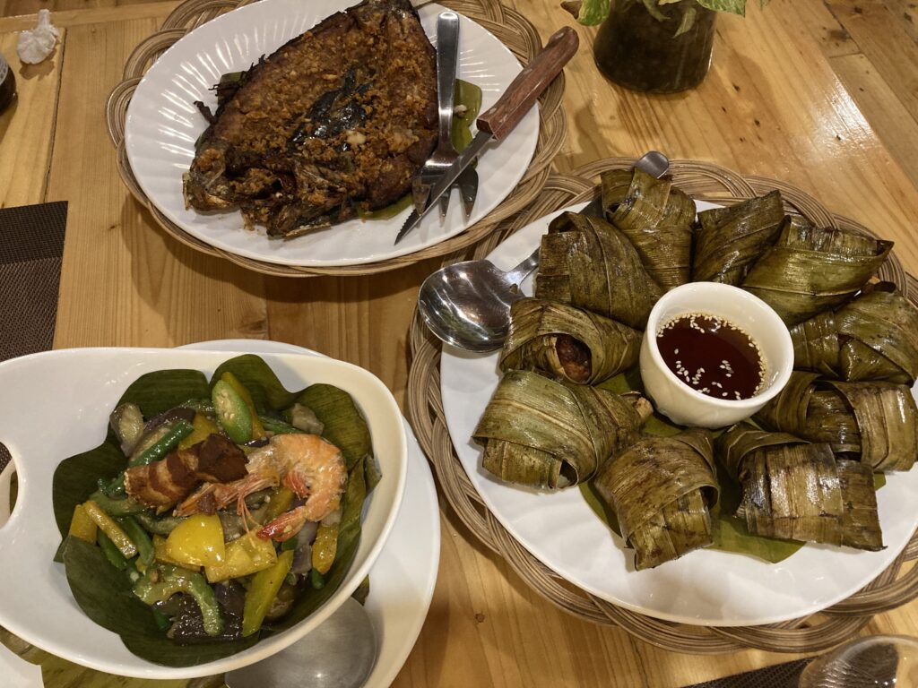 しばらくすると、注文した料理がテーブルに並んだ。ビーチリゾートに来ると、やはりシーフードを食べたくなる。魚やエビに加えて、バナナの葉で包んで焼いたチキンも注文(写真右下)。これはどうやらセブの名物料理のひとつらしい。どれもうまいっ!心地よい風を感じながら、ほろ酔いでホテルへの帰路についた。