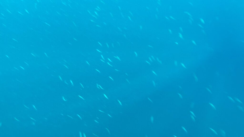 海底が落ち込む近辺を、慎重に岸の方向を確認しつつ遊泳する。すると、小さな光の大群だ!しかも大漁(笑)!群れに追いつき追い越し、自分の体を何度も反転させながらそれを目に焼き付ける。イワシにしては少し小さめだが、ものすごい大群が光を反射し海を泳ぎ回っている。「トルネード」を形作るほど大量ではないにしろ、きっと彼らが大人になったときには美しい渦を描くのだろう。私の撮影技術は限りなくど素人であることをここに陳謝しておく…(笑)
