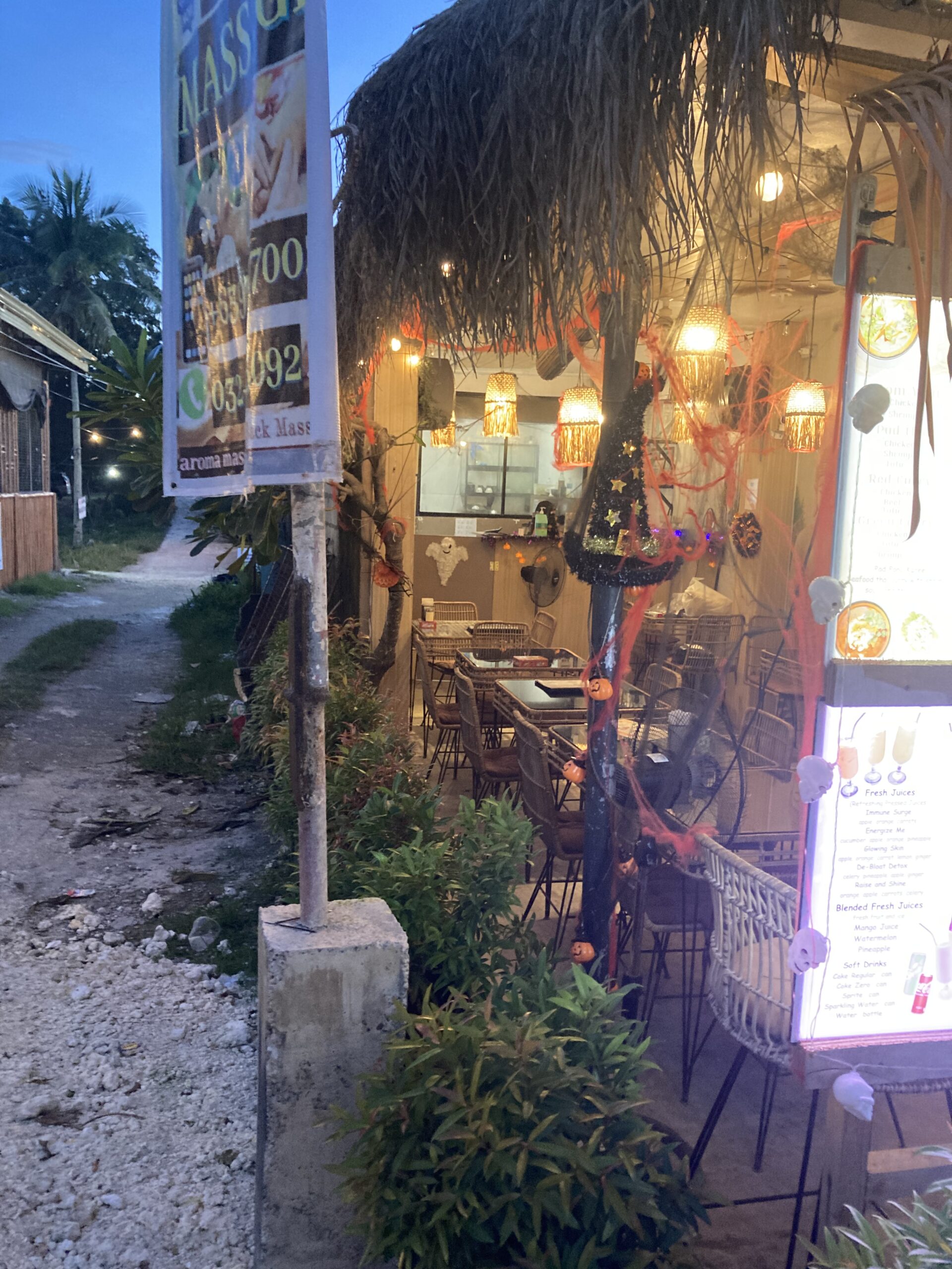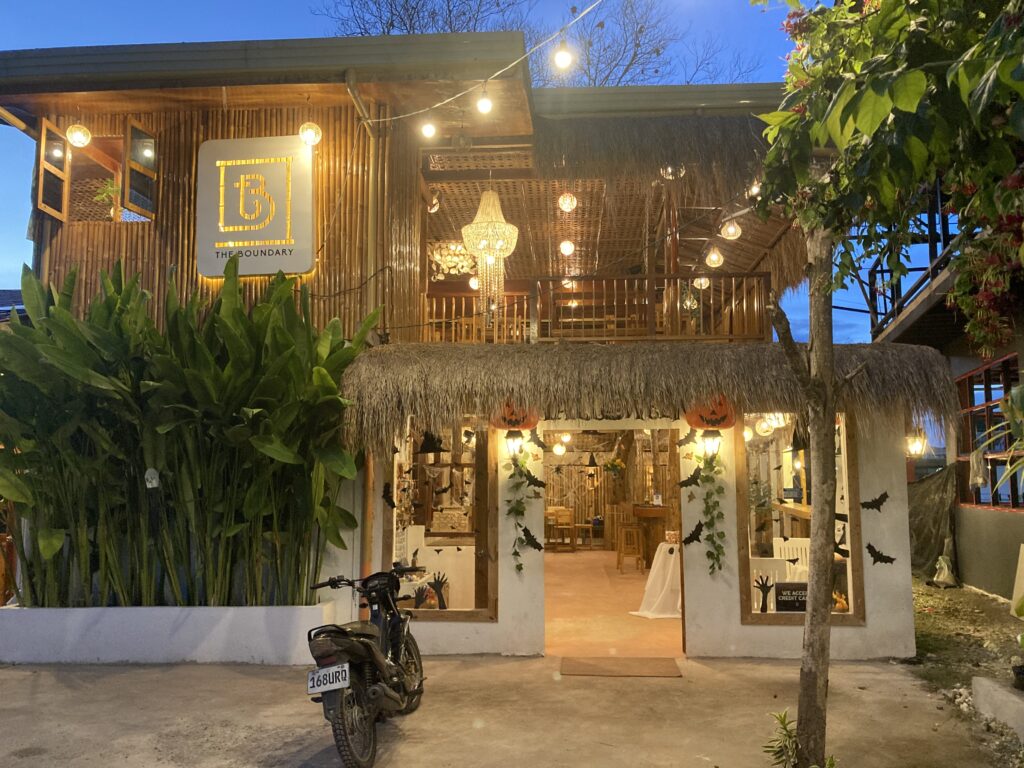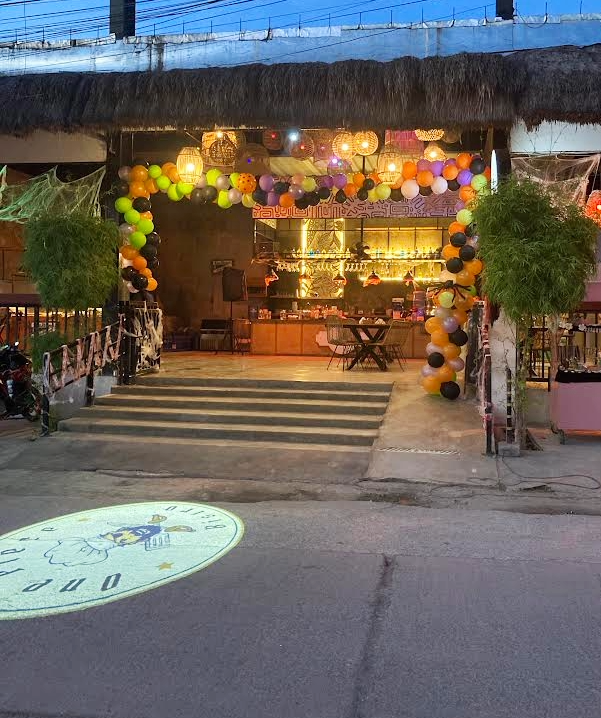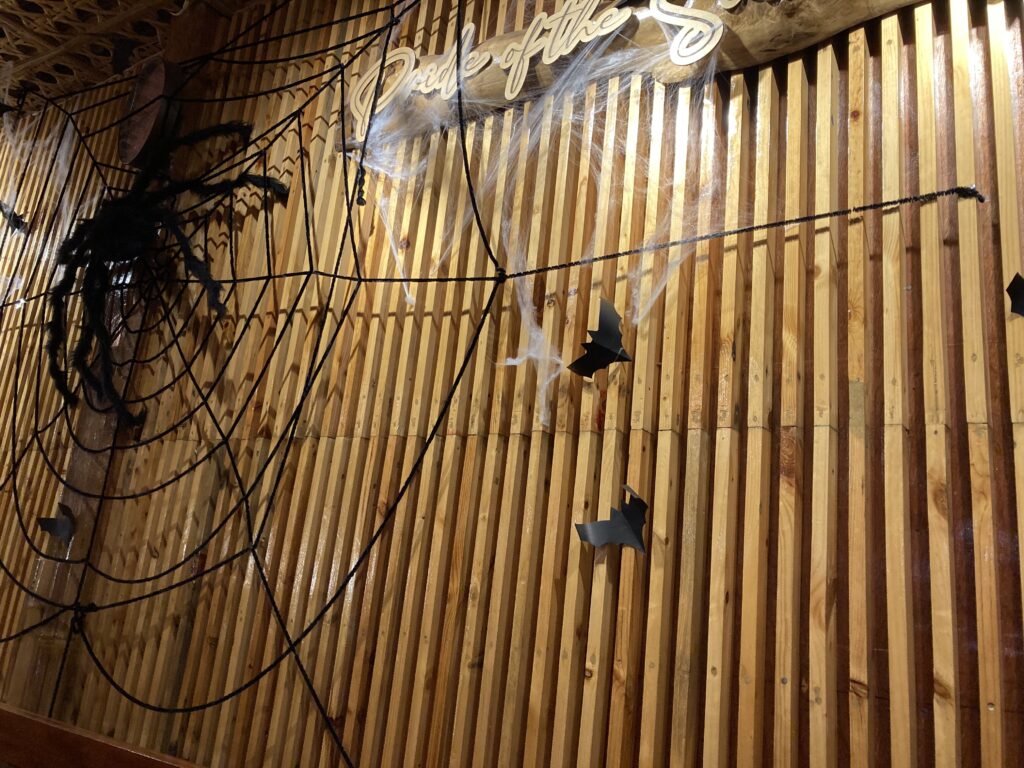 旅行先で1年に1度のイベントに遭遇した特別感を満喫しつつ、本日のレストランに到着。パンプキンがお出迎えだ。** いつも通り、困ったときのグーグル先生に相談し、評判の良いフィリピン料理の店を見つけておいた。2階席へと案内されると、壁一面のコウモリやクモの巣の装飾にかなりの気合を見て取れる(笑)。